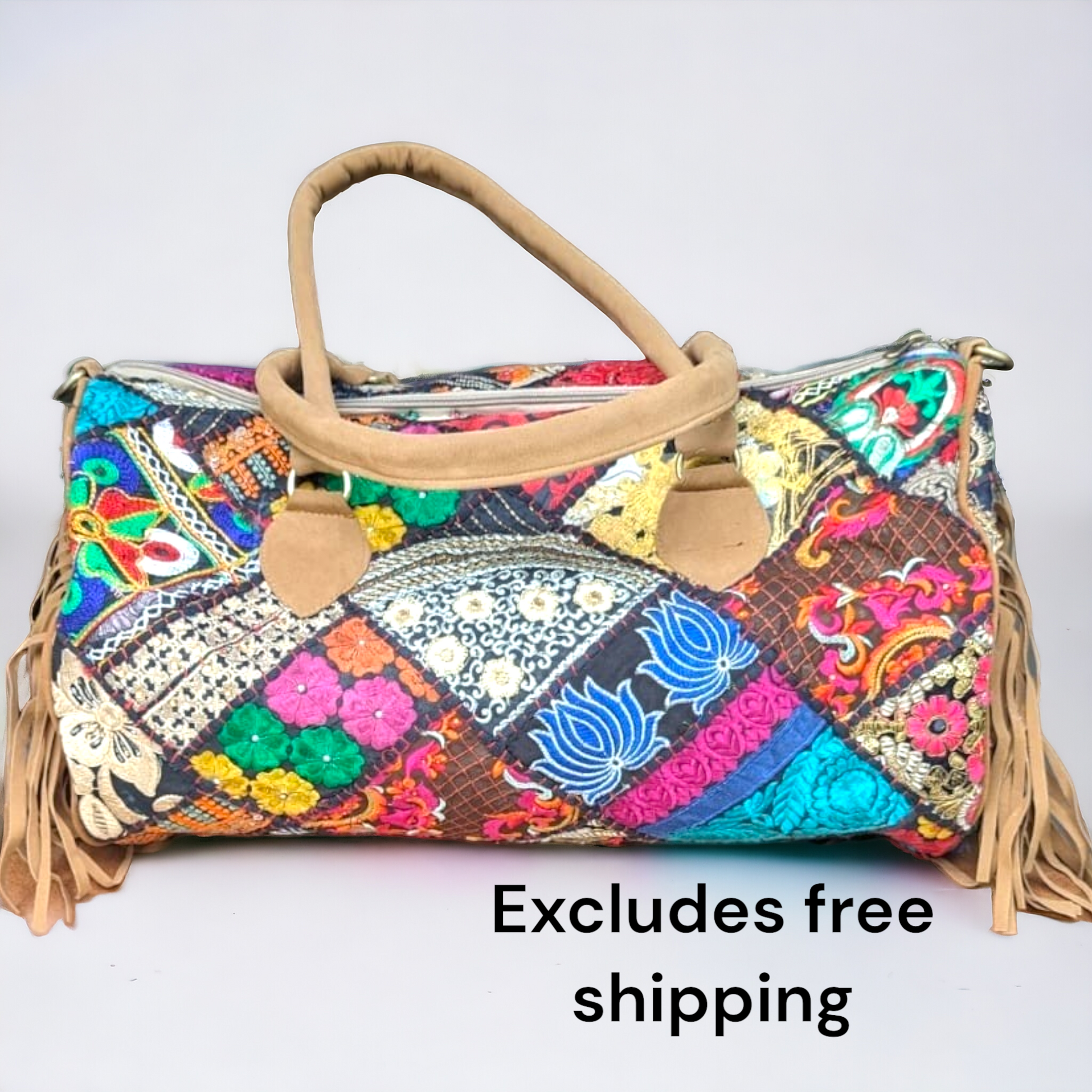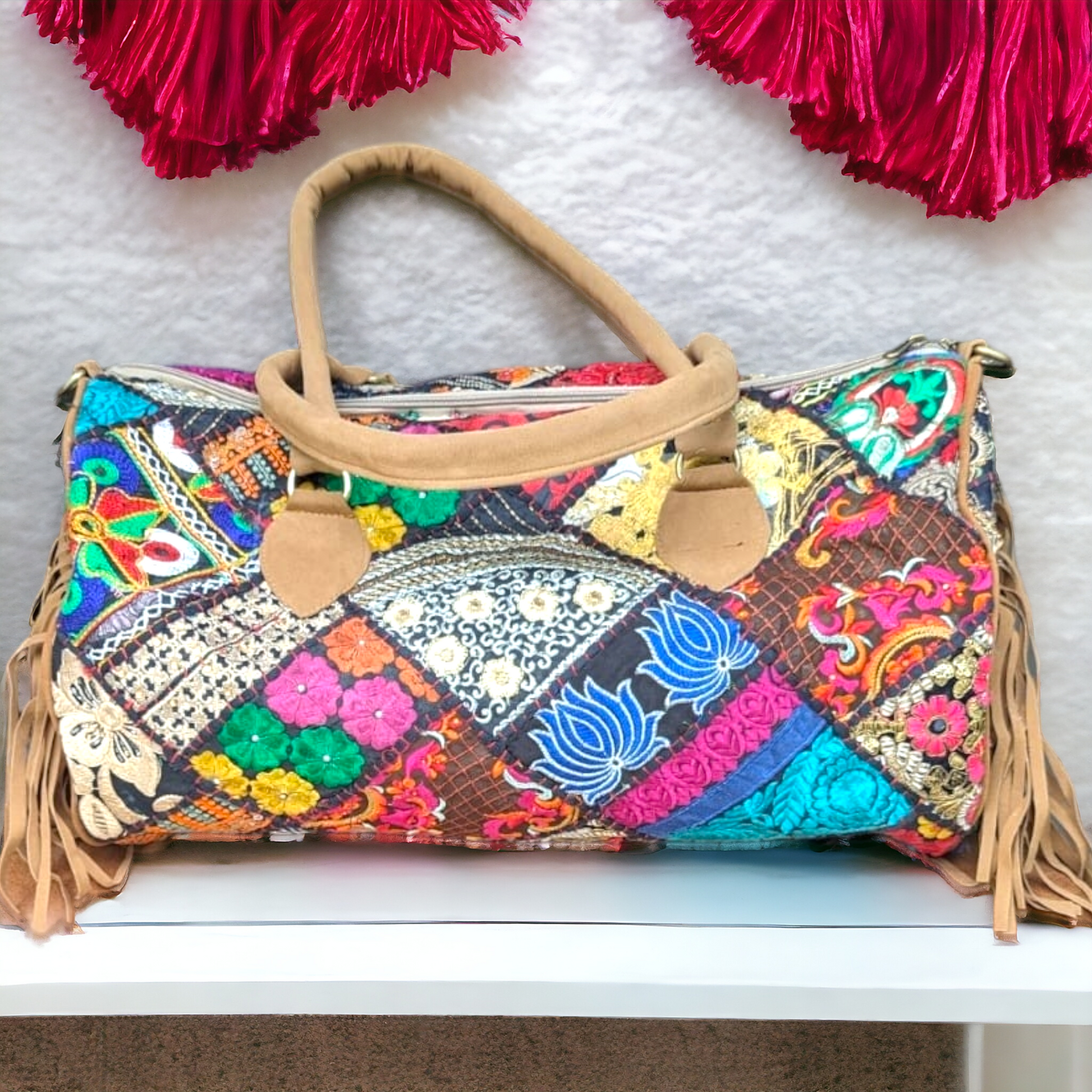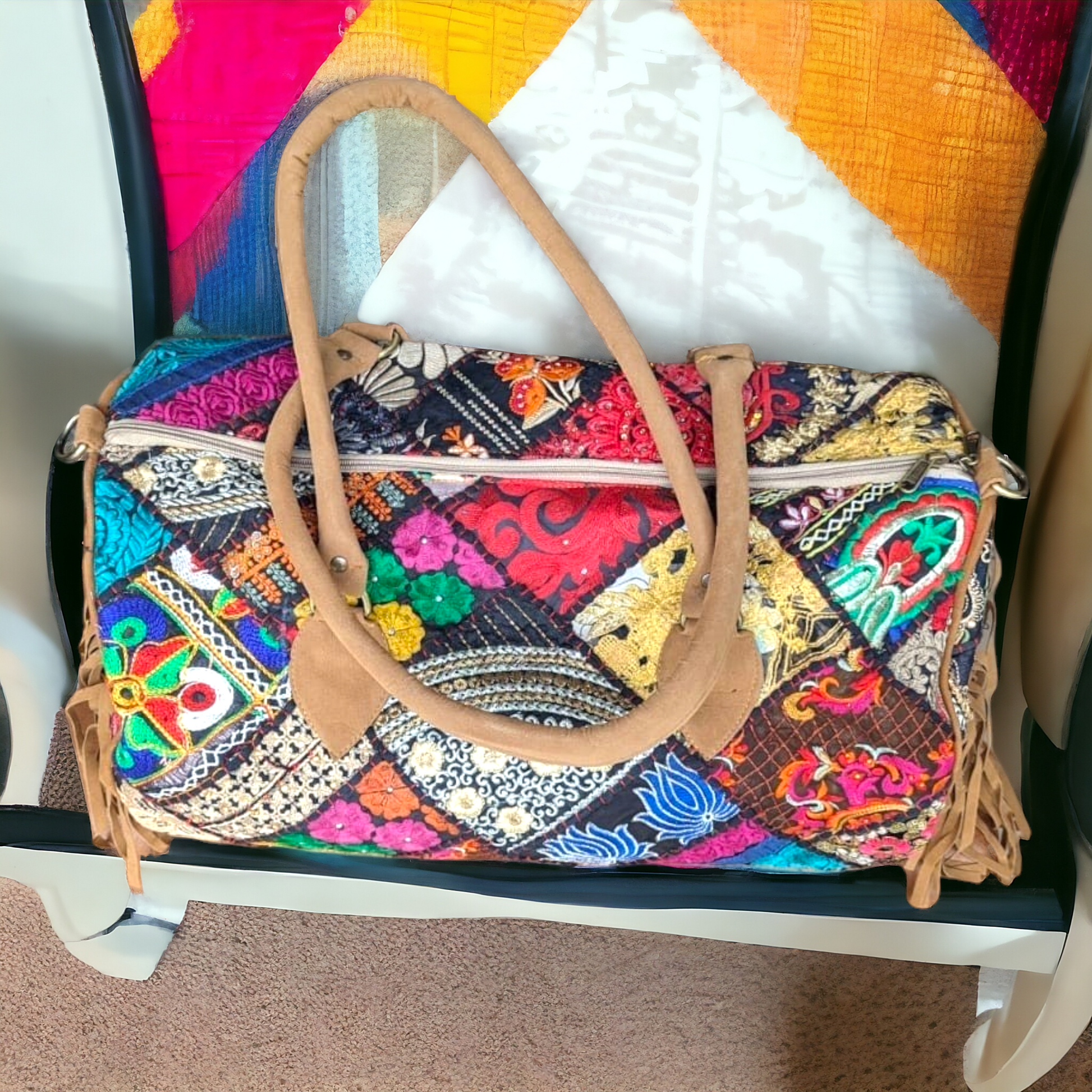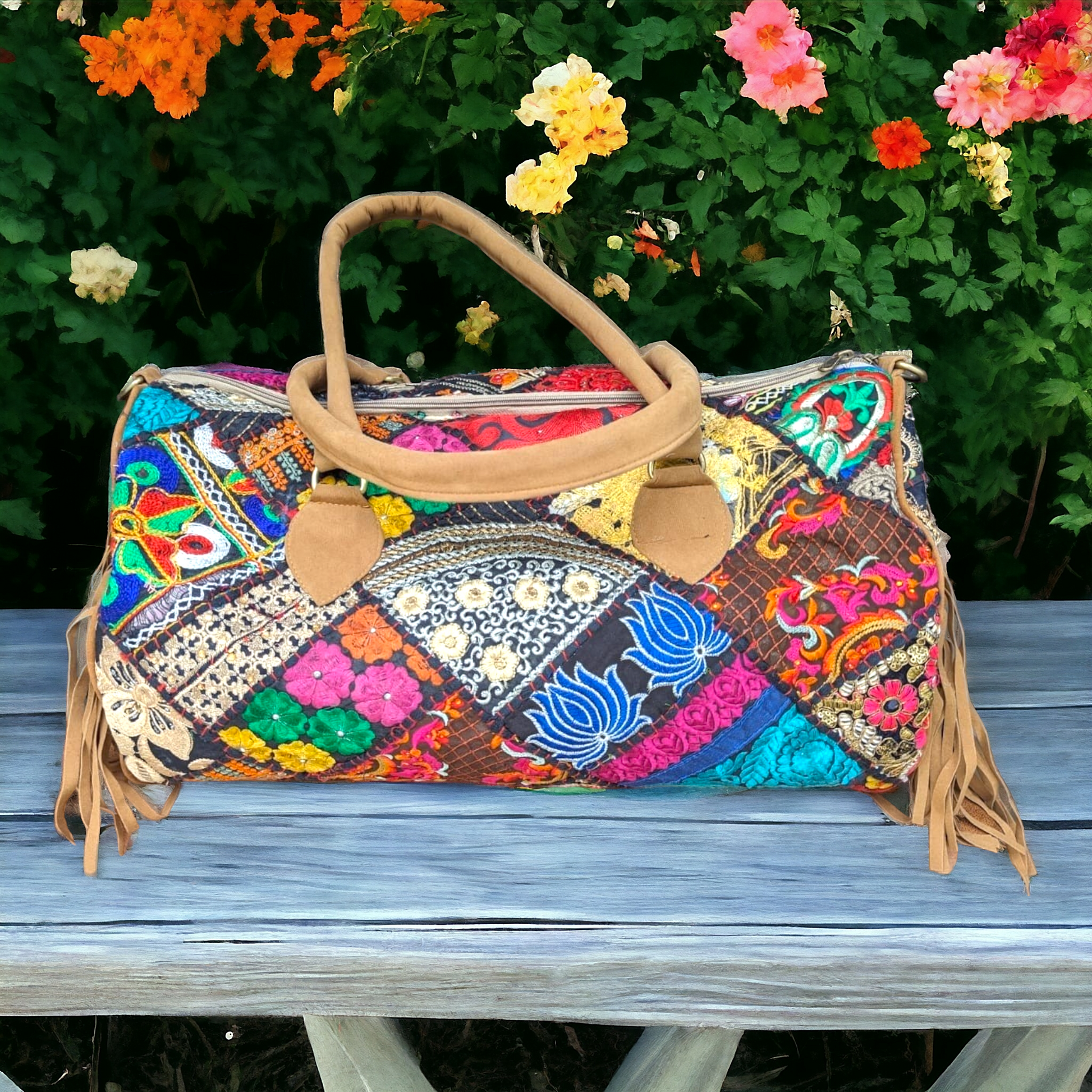 Experience the perfect blend of style and functionality with our Boho Duffle Bag. This beautiful bag features intricate embroidery patchwork, giving it a unique and eye-catching look. Whether you're heading on a trip or hitting the gym, the ample space and zip pocket inside make it the ideal companion. Crafted with sturdy material and a sturdy design, it can carry all your essentials effortlessly. Plus, it's compact enough to use as a carry-on luggage for your next flight!*