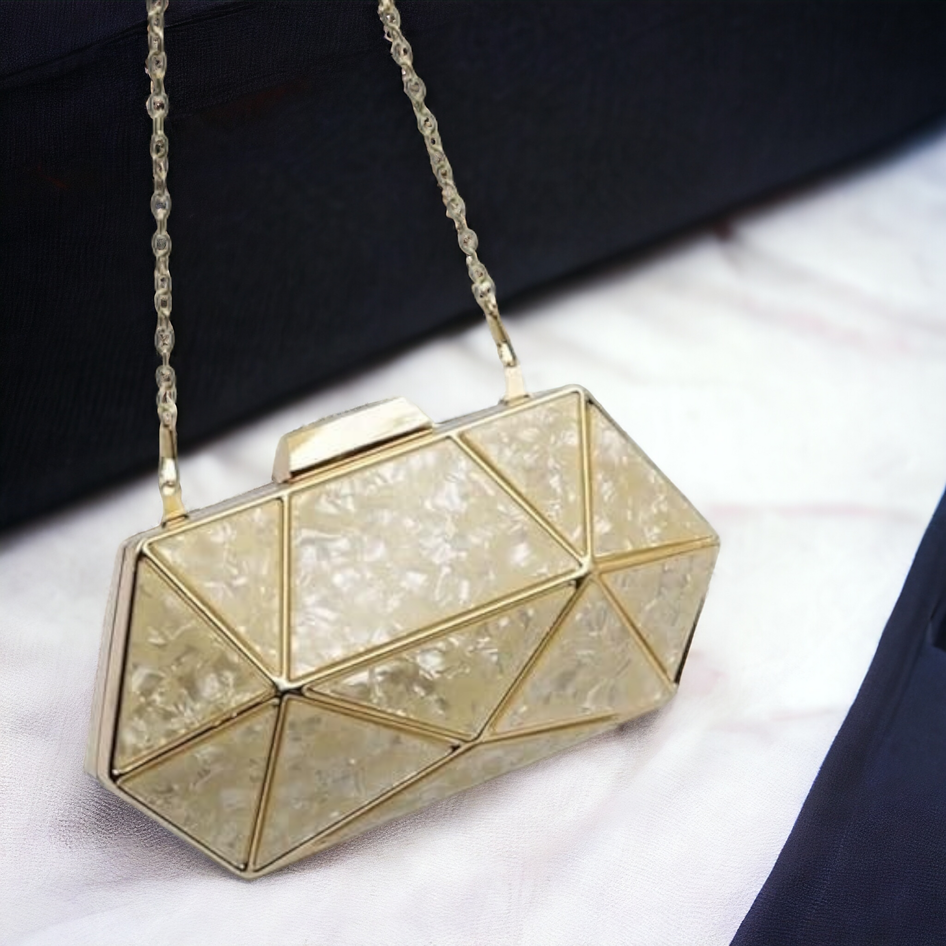 Expertly crafted from acrylic, this beautiful pearl-colored clutch is the perfect accessory for any occasion. The unique design adds a touch of elegance to any outfit. Make a statement with this stunning clutch that is sure to turn heads.Crafted with high-quality materials, this clutch is both durable and fashionable.It also includes a detachable chain for easy conversion into a sling. Perfect for any occasion, this must-have provides enough space for all your essentials.