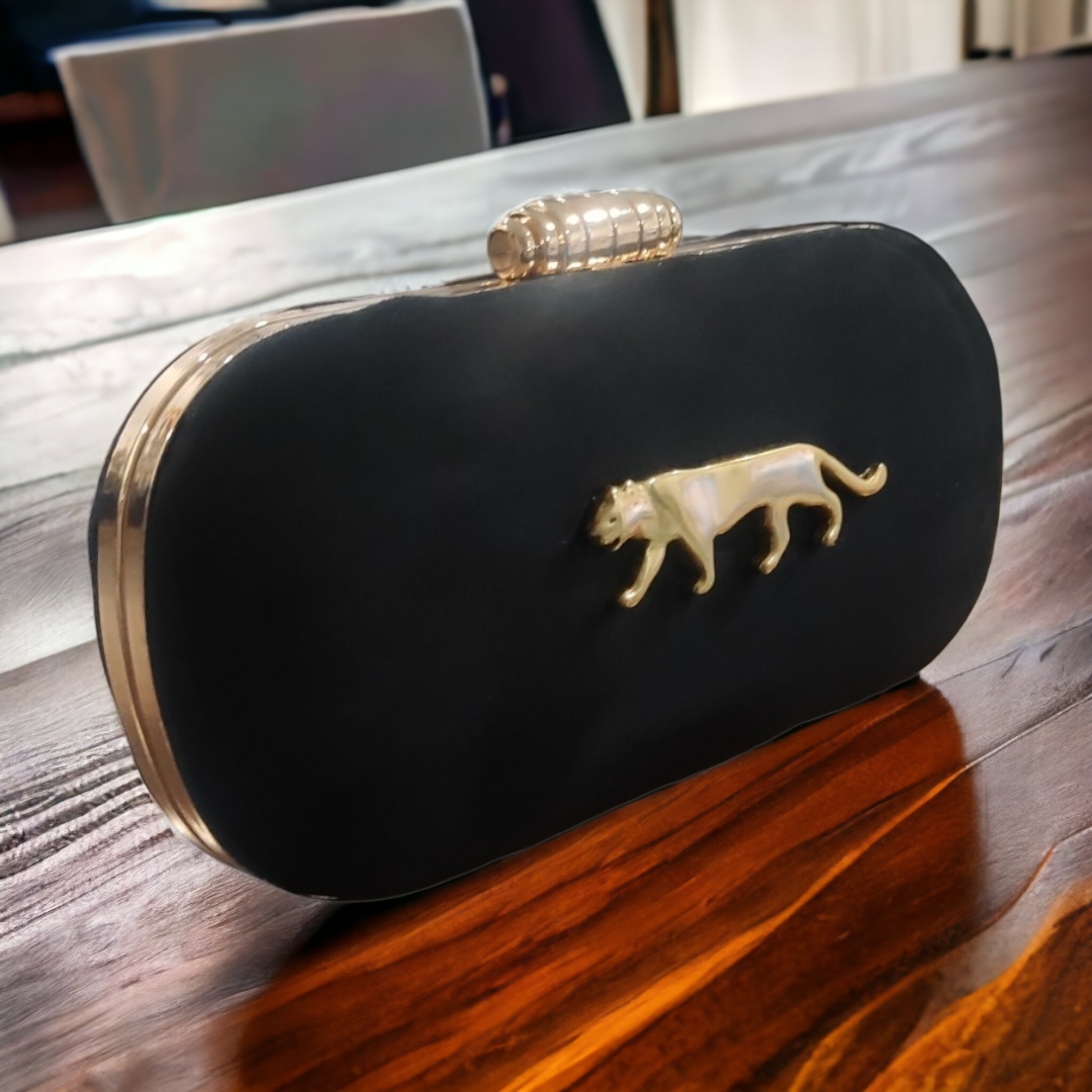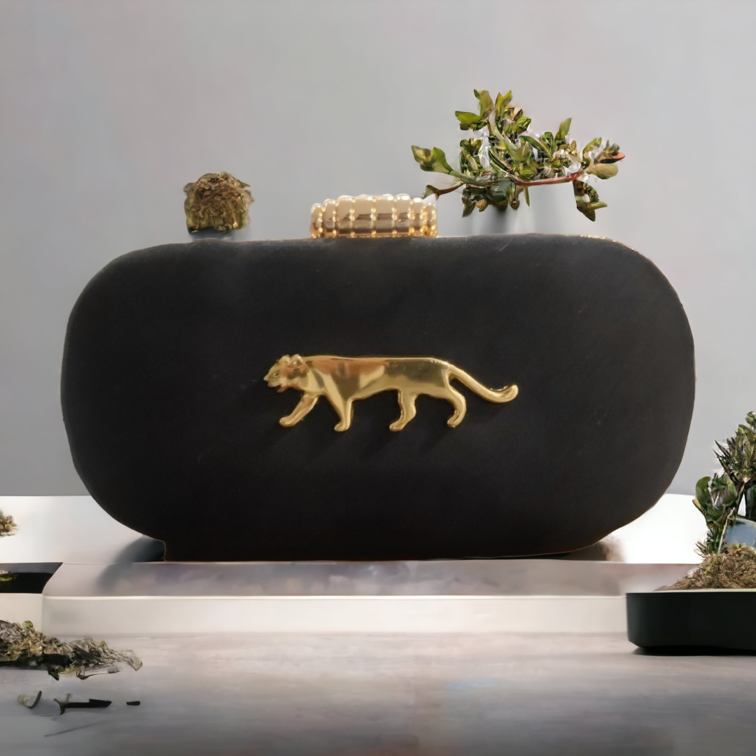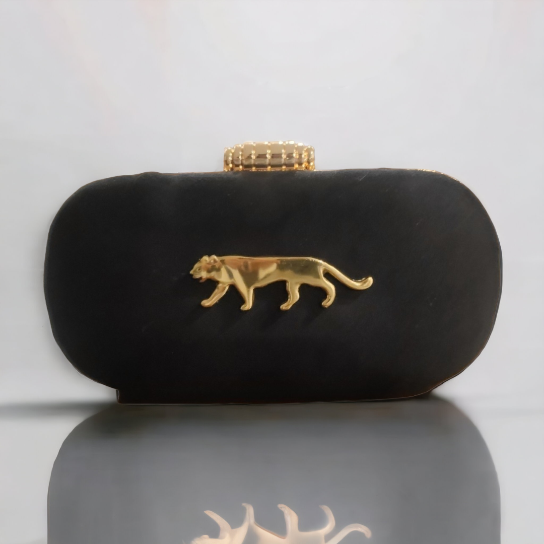 Brass Panther clutch - Crafted with a durable frame this elegant rectangular curved frame clutch easily converts into a messenger sling for added convenience. With a convertible sling, it's perfect for any active lifestyle. Whether you're carrying your everyday essentials or travelling light, this stylish clutch will help you stay sleek and organized.