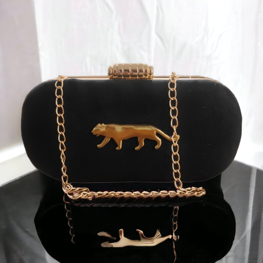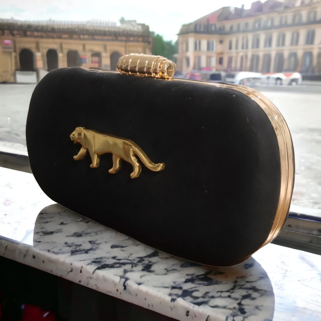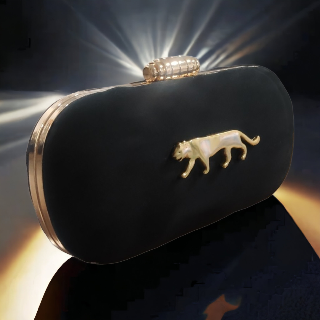 Brass Panther clutch - Crafted with a durable frame this elegant rectangular curved frame clutch easily converts into a messenger sling for added convenience. With a convertible sling, it's perfect for any active lifestyle. Whether you're carrying your everyday essentials or travelling light, this stylish clutch will help you stay sleek and organized.