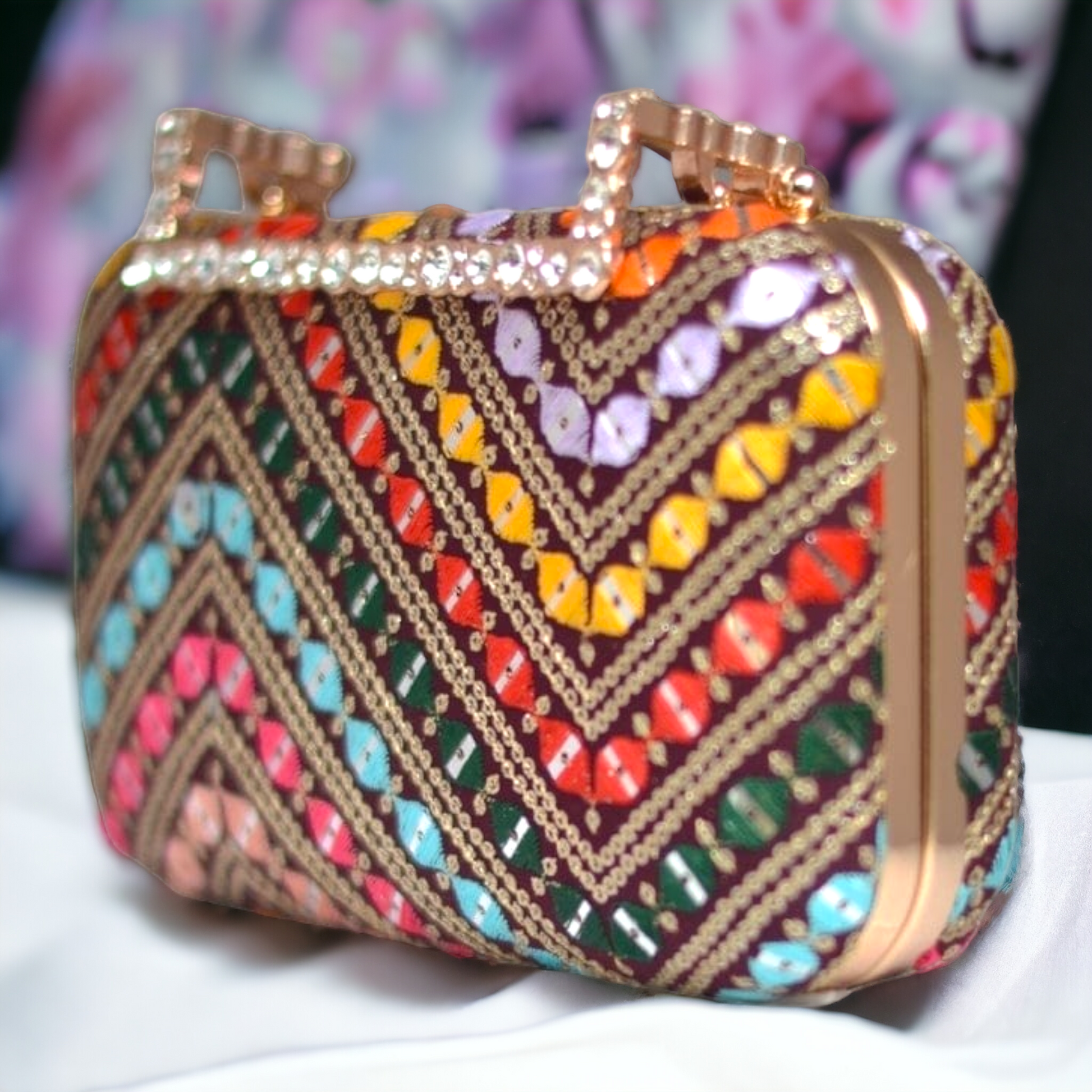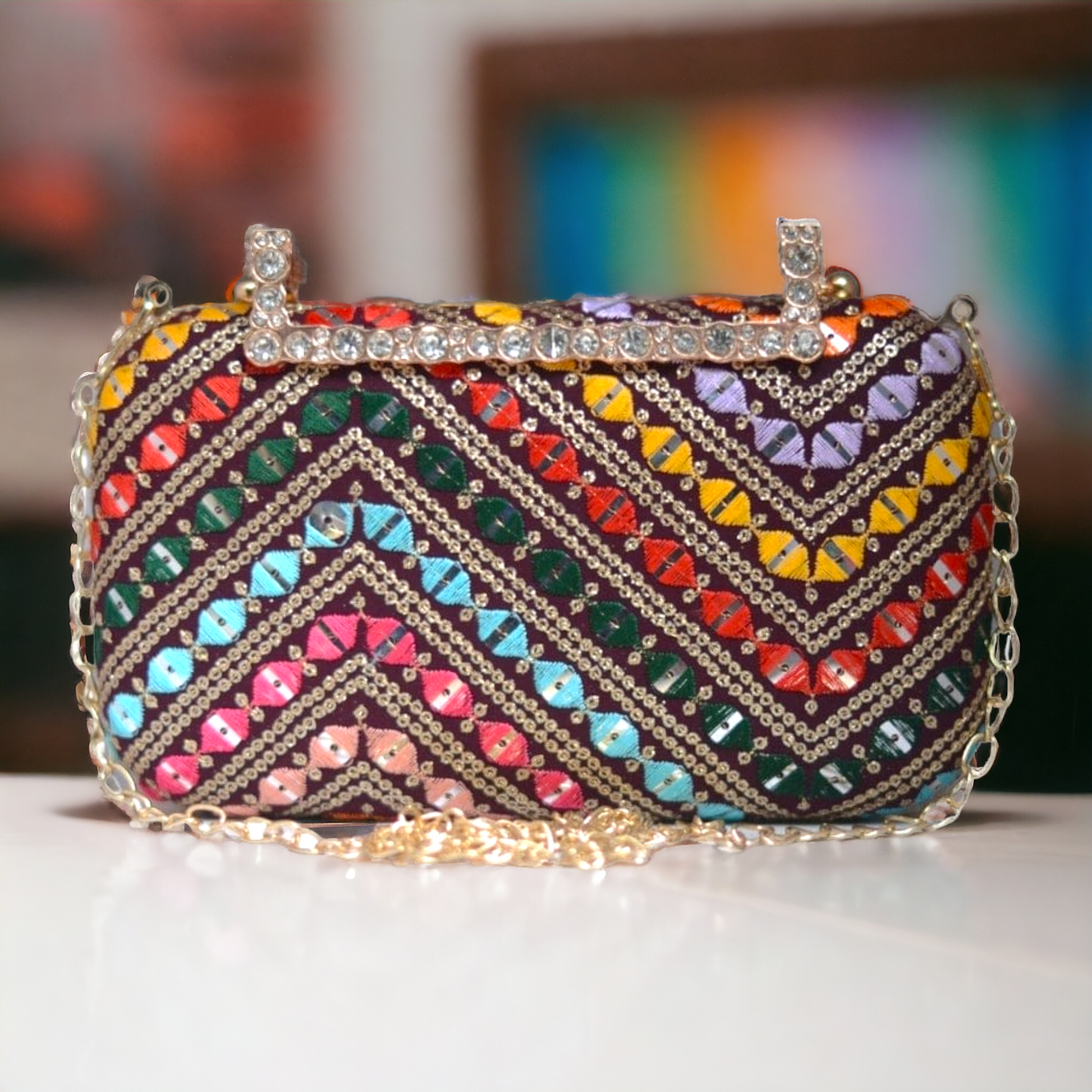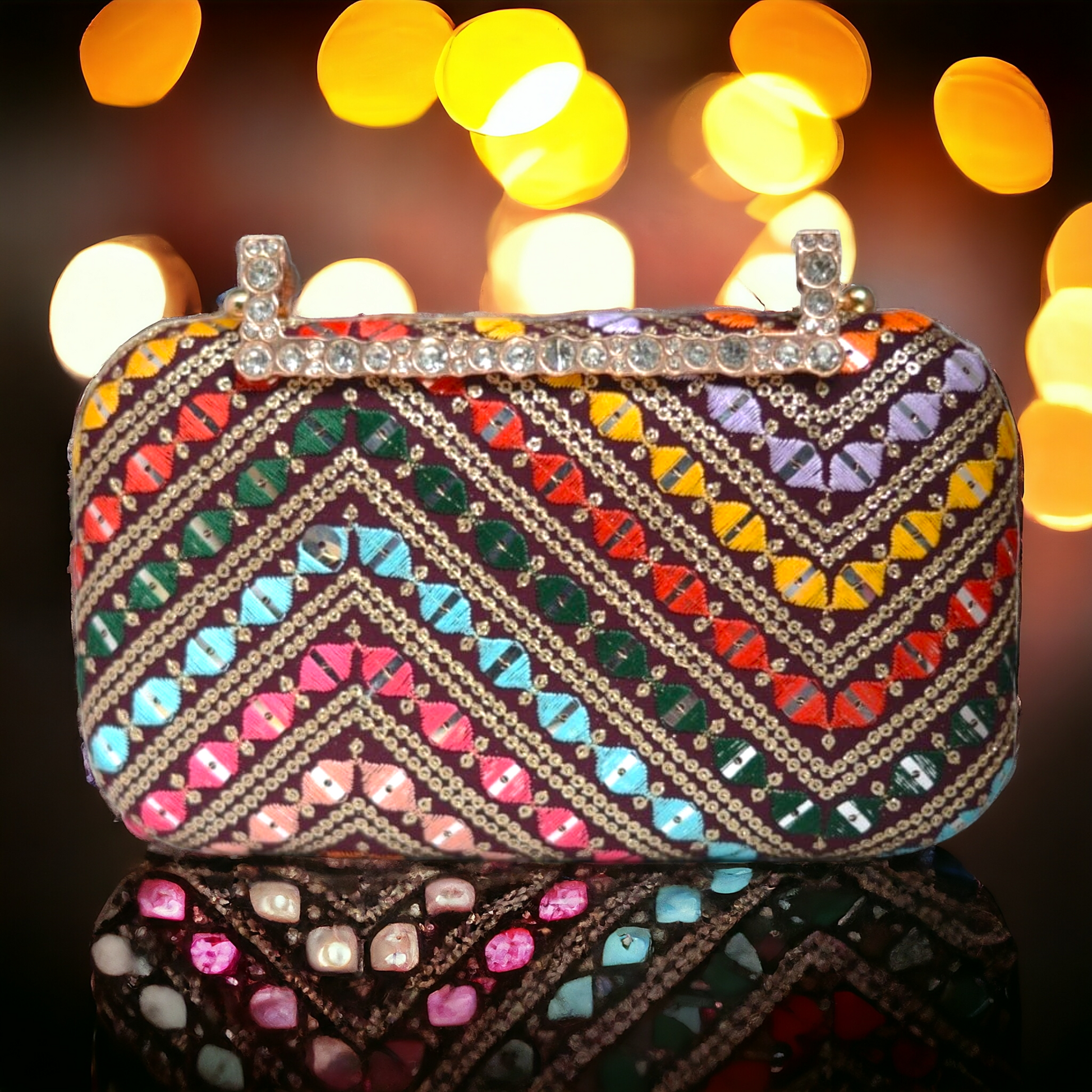 Introducing the Clutch - Colours train, a must-have accessory for every evening event. With its vibrant colors and elegant embroidery, it will surely make you stand out in any party.Crafted with a durable frame, embedded zircon on the handle this elegant rectangular frame clutch easily converts into a messenger sling for added convenience. Its spacious design make it perfect for carrying all your essentials. Upgrade your style game with this chic and classy clutch.Crafted with a durable frame, embedded zircon on the handle this elegant rectangular frame clutch easily converts into a messenger sling for added convenience.