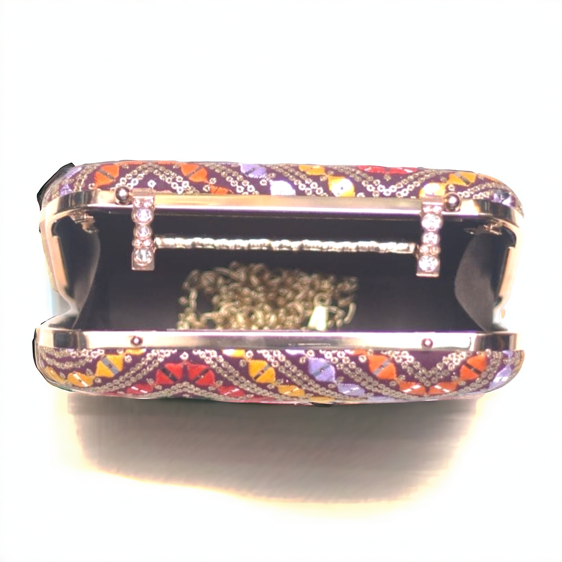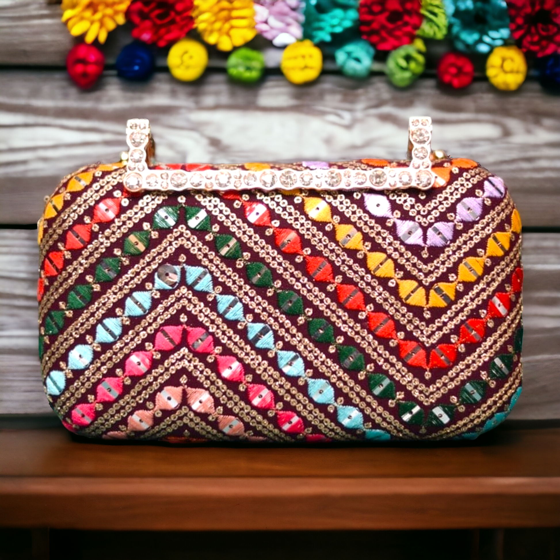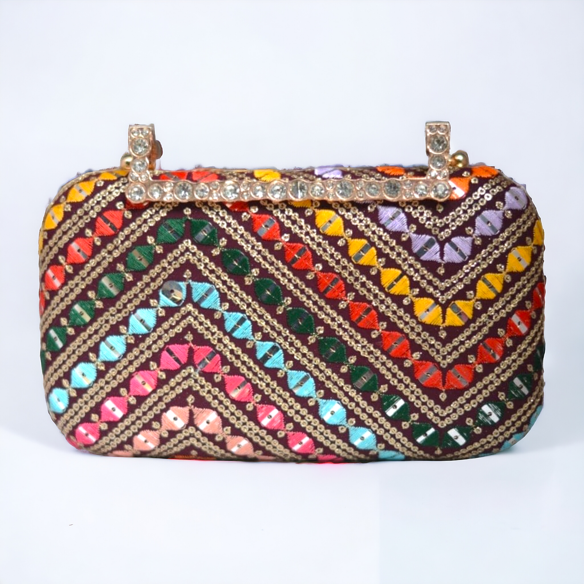Introducing the Clutch - Colours train, a must-have accessory for every evening event. With its vibrant colors and elegant embroidery, it will surely make you stand out in any party.Crafted with a durable frame, embedded zircon on the handle this elegant rectangular frame clutch easily converts into a messenger sling for added convenience. Its spacious design make it perfect for carrying all your essentials. Upgrade your style game with this chic and classy clutch.Crafted with a durable frame, embedded zircon on the handle this elegant rectangular frame clutch easily converts into a messenger sling for added convenience.