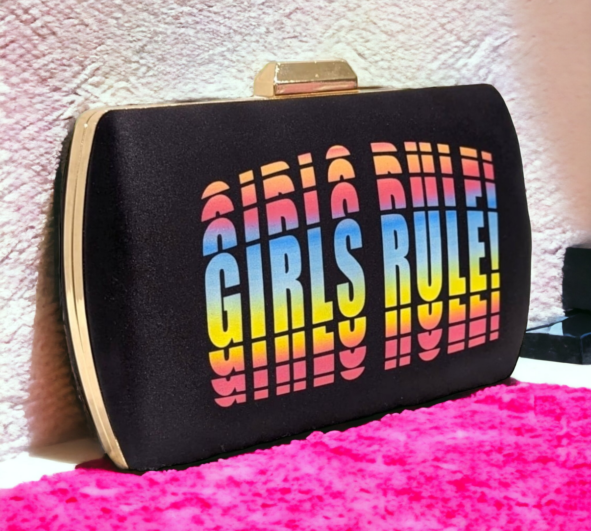 Girls Rule clutch - Crafted with a durable frame this elegant rectangular frame clutch easily converts into a messenger sling for added convenience. With a convertible sling, it's perfect for any active lifestyle. Whether you're carrying your everyday essentials or travelling light, this stylish clutch will help you stay sleek and organized.