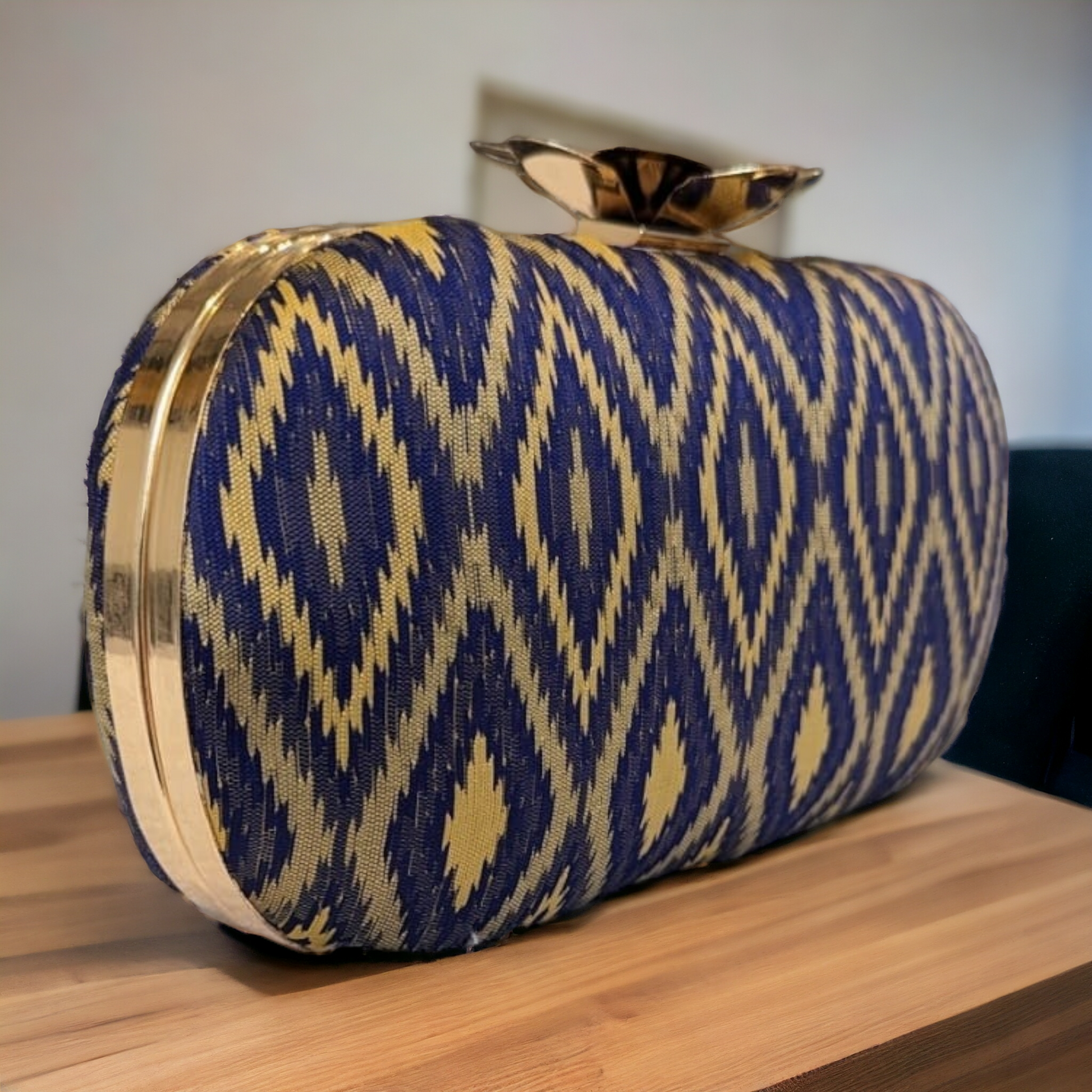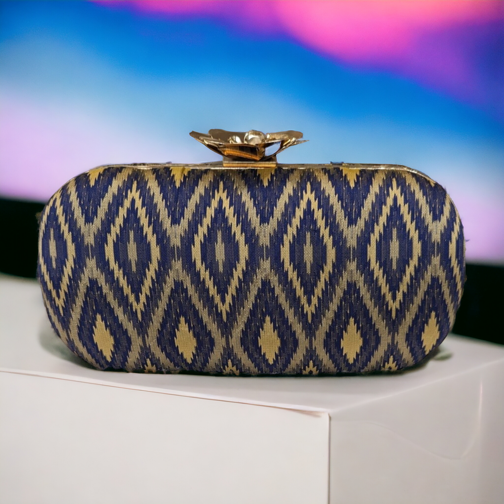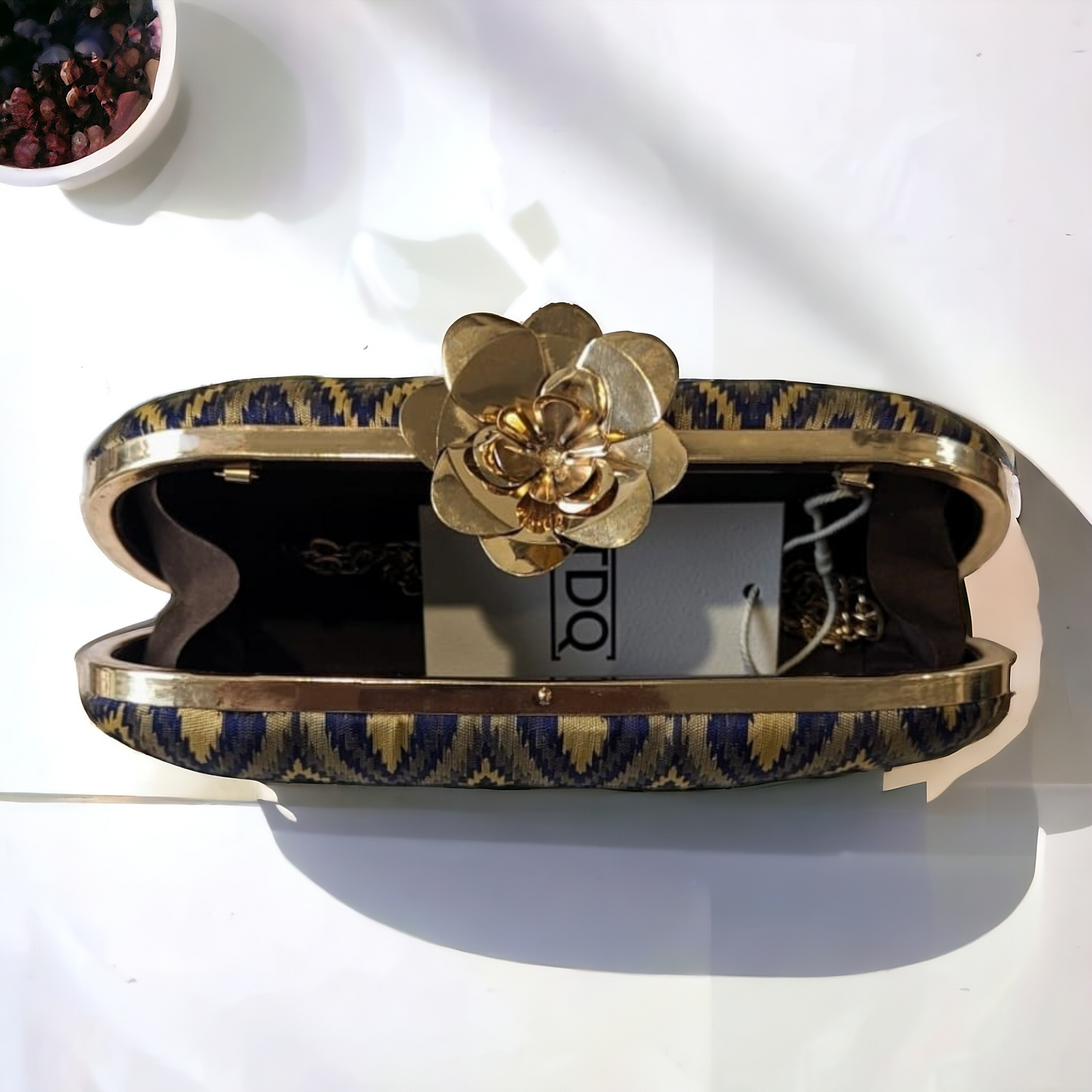 Experience classic elegance with the Metal Flower Capsule Clutch. This versatile clutch is perfect for every occasion, and the beautiful metal flower enhances its charm. The intricate blue and golden patterns on the body add a touch of sophistication to any outfit. Elevate your style with this statement piece. Its spacious design allows for all your essentials, and the convertible sling with detachable chain adds a touch of versatility. Made with durable material, it's a fashionable and practical addition to any outfit.