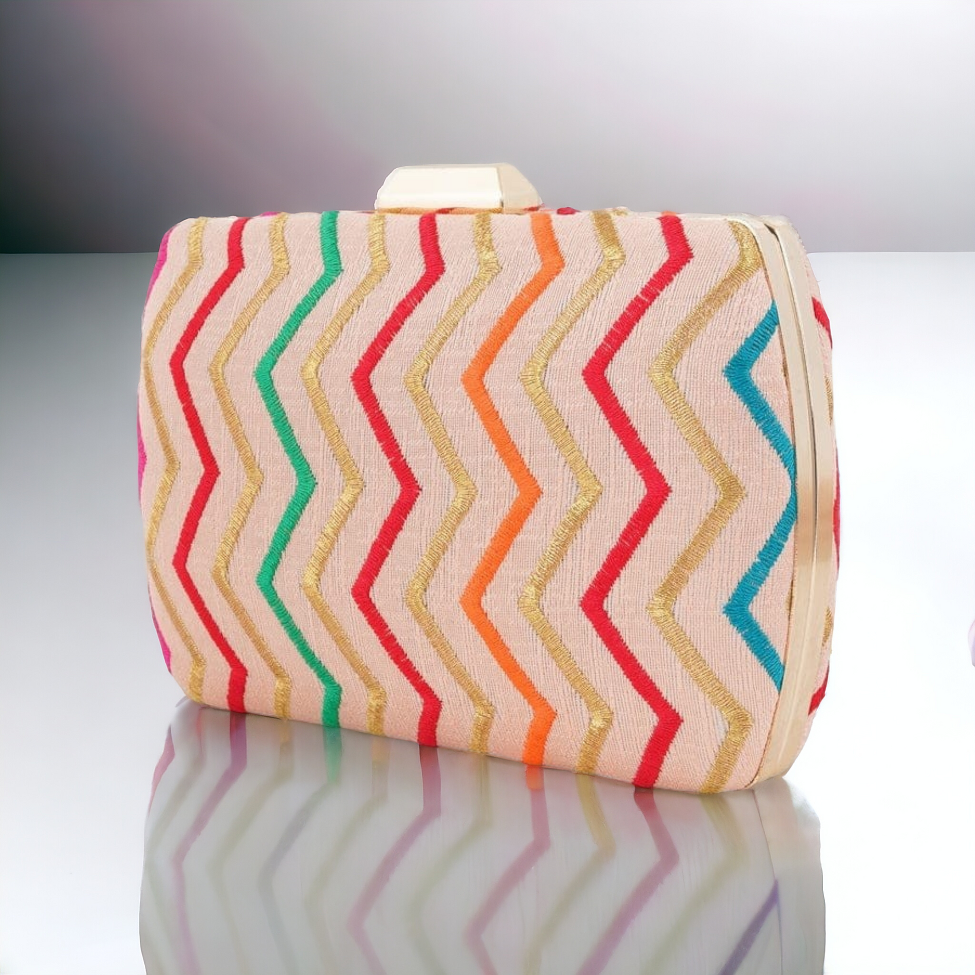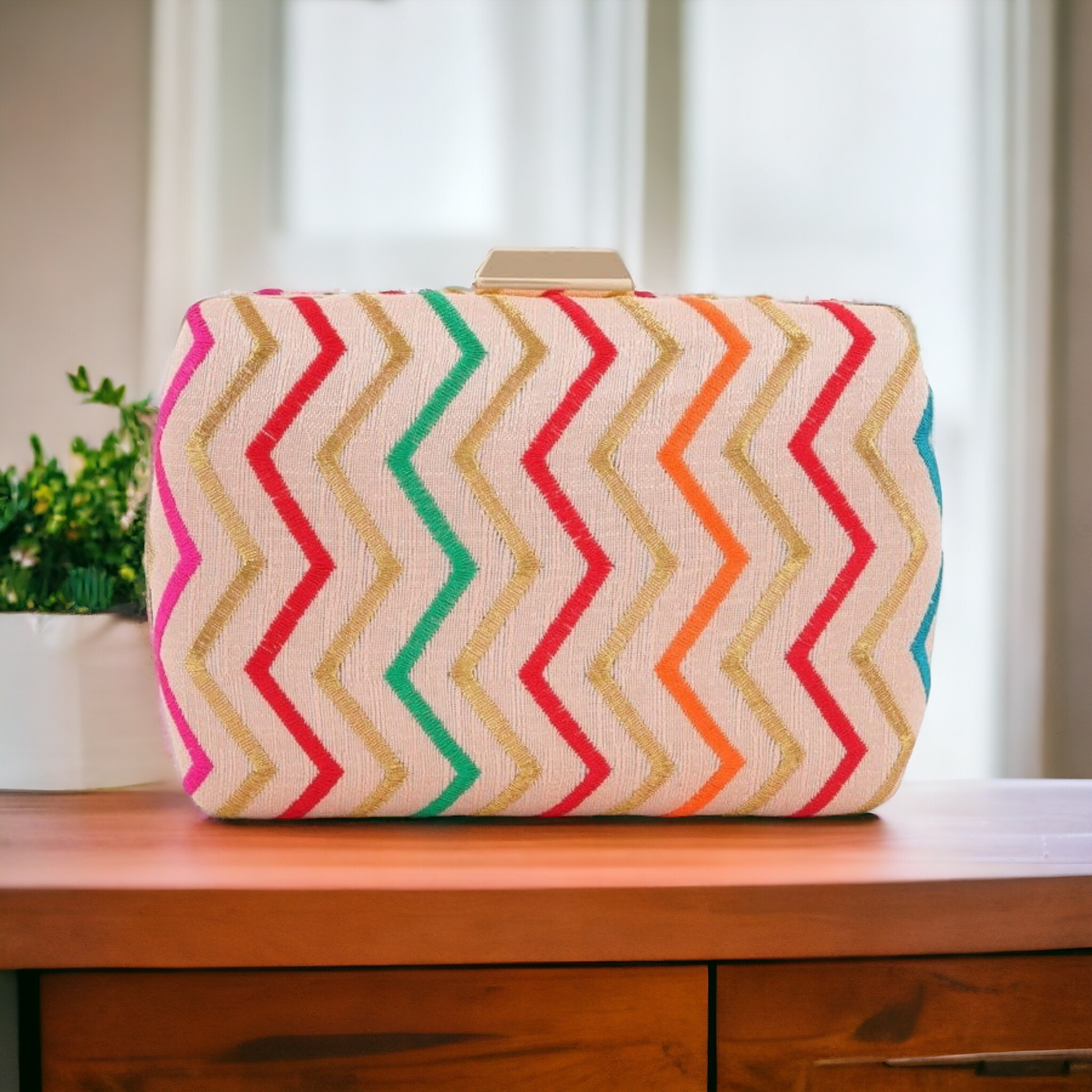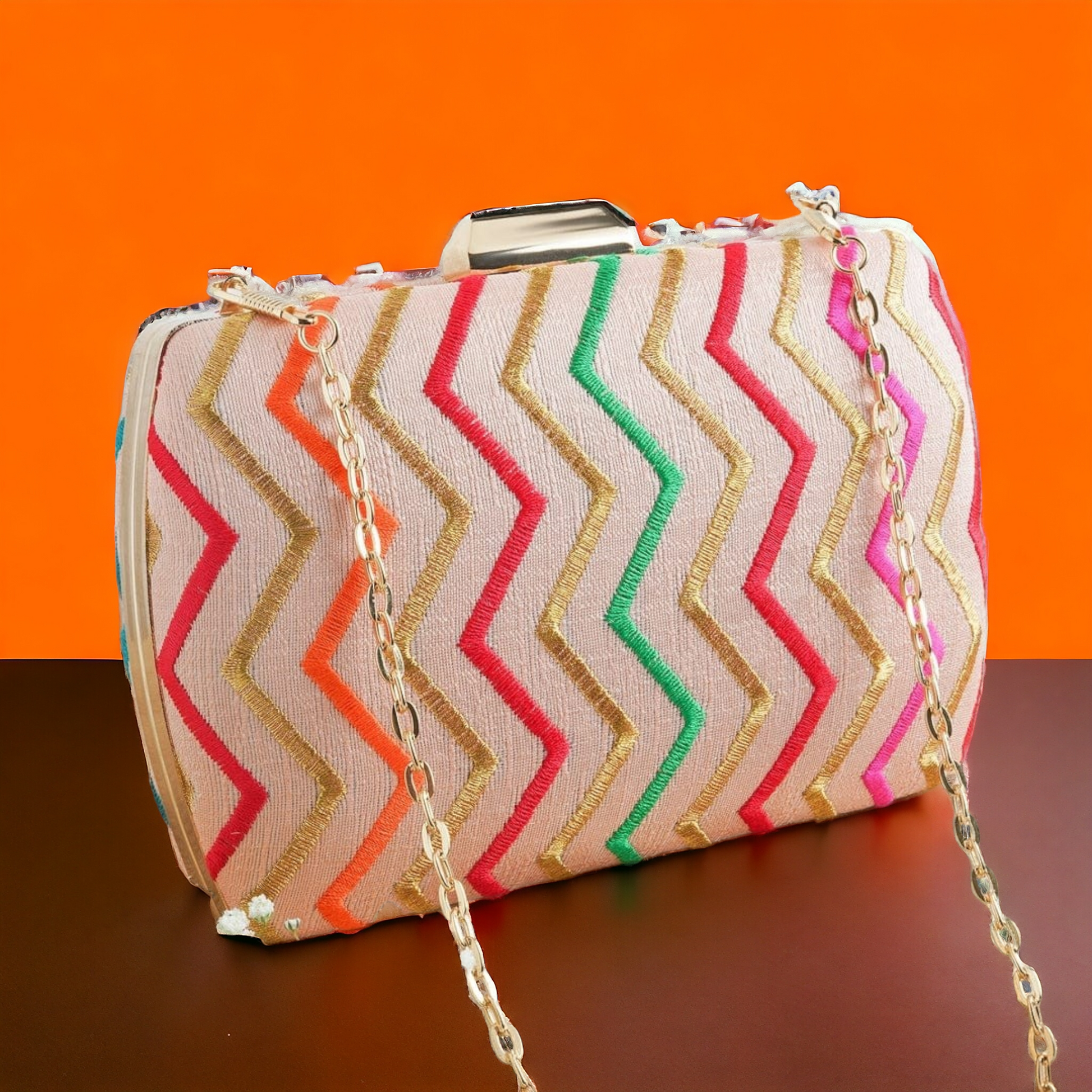 This elegant clutch is perfect for both daily use or for special evenings. Its classic zigzag thread embroidery adds a touch of sophistication and style. Crafted with high-quality materials, this clutch is both durable and fashionable. Elevate your wardrobe with this puffy zigzag clutch. Its eye-catching design, it is sure to make a statement and elevate any look.